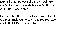 | In die Euro-Banknoten wurden eine Reihe von UV- und anderen Sicherheitsmerkmalen eingearbeitet, damit Sie eine echte Banknote leicht auf einen Blick erkennen können. Die Euro-Banknoten werden auf Papier aus reiner Baumwolle gedruckt, das sich spürbar von normalem Papier unterscheidet. Durch die Verwendung einer speziellen Drucktechnik sind einige Bildelemente auf der Vorderseite der Banknoten ertastbar. |